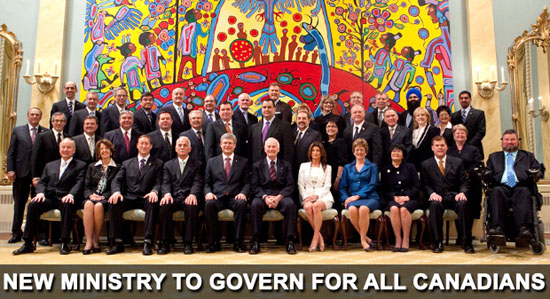 【加国生活网编译报道】总理哈珀在2011年5月18日星期三上午宣布保守党多数政府的新内阁名单,并随即在总督府举行了内阁成员宣誓就职仪式。新内阁总共由38位部长组成,规模与前一届内阁差不多。