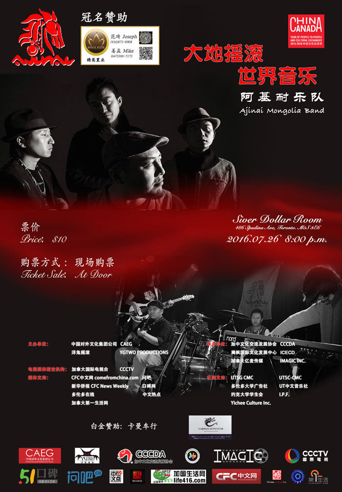 7月26日晚,由中国对外文化集团公司与洋鬼摇滚主办,阿基耐乐队联合WAV,MOONFALL,MAYBE REFUGE,SIXSY等多支本地摇滚乐队,精英置业范琦、姜孟先生冠名赞助的“阿基耐乐队--大地摇滚、世界音乐演唱会”将在多伦多Silver Dollar Room举办,让更多加拿大观众聆听来自草原的声音。