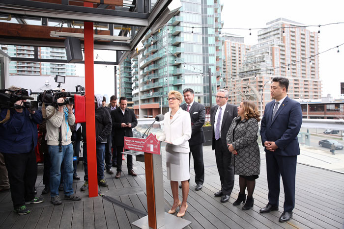 图示省长韦恩向传媒介绍省府今日推出的公平住房计划措施。在她背后的为安省财政厅厅长苏善民(左)、安省房屋事务厅厅长兼削贫战略负责人巴拉德(左二)、省议员Cristina Martins(右二)及省议员董唅鹏(右)。