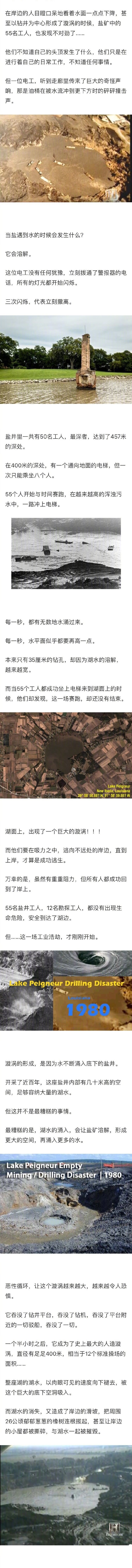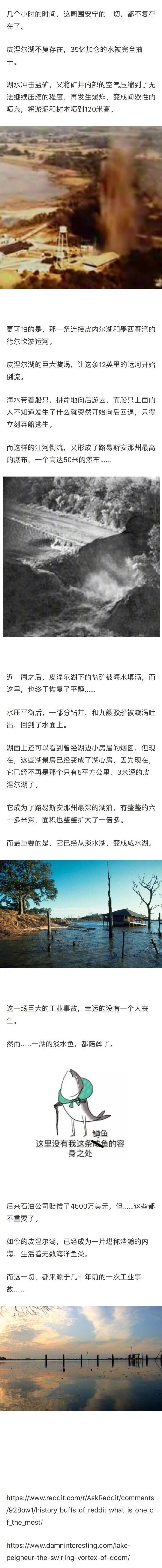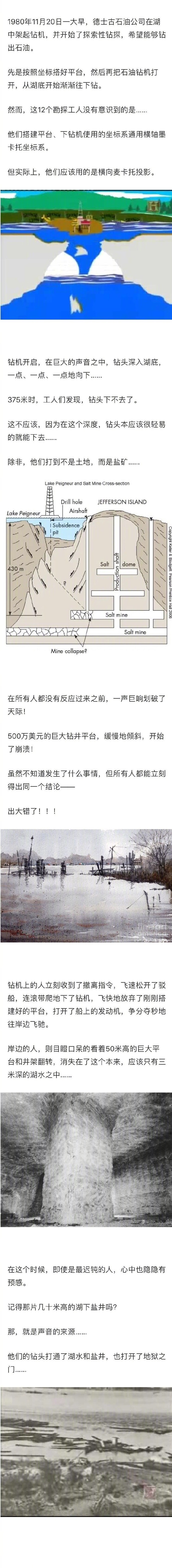 1980年,皮涅尔湖上的钻头,钻通了湖水和盐矿。无数湖水涌入盐矿,让江河倒流,形成了史上最大的人造漩涡,高达50米的瀑布。 因为一个35厘米的钻孔,这个本来只有3米深的淡水湖,就这样成为了路易斯安那州最深的盐水湖泊……