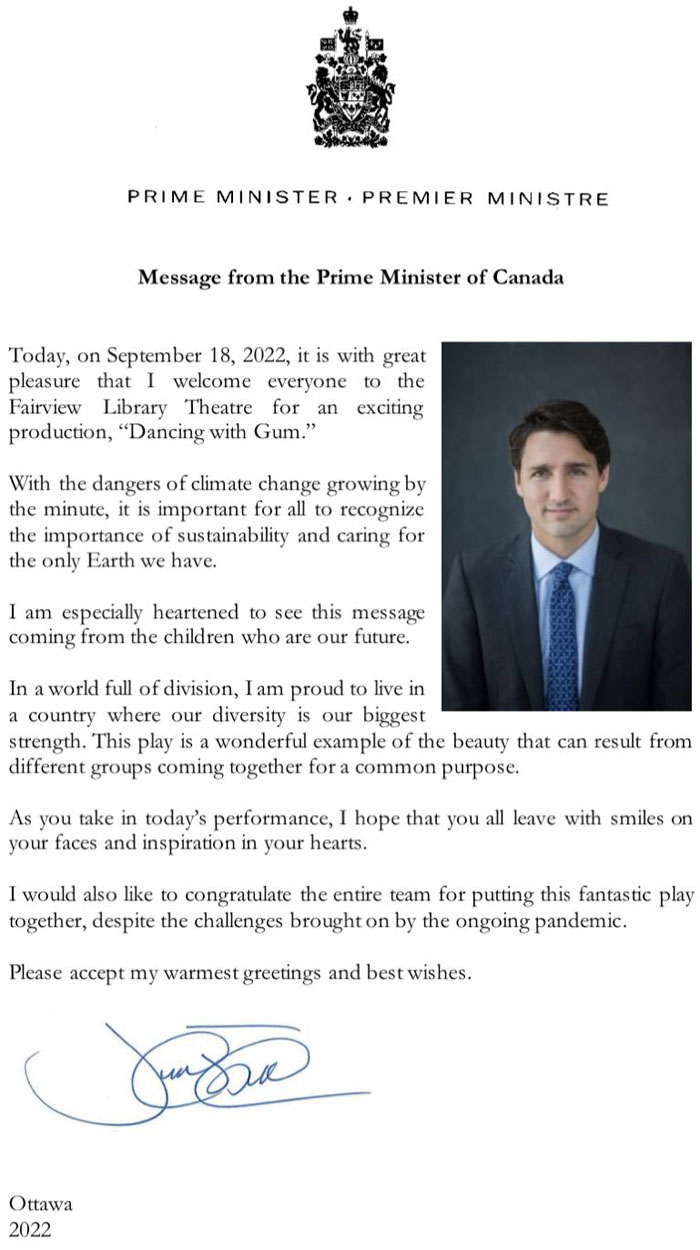 加拿大总理Justin Trudeau发来贺信,他说:这部剧是不同群体为共同目的走到一起带来的美丽的绝佳例子,并对整个团队表示祝贺,尽管持续的疫情带来了挑战,但是他们还是把这个精彩的戏剧呈现出来。同时制作组还获得了来自City Councillor Nick Mantas ,City Councillor Shelley Carroll , City Councillor陈志辉先生的贺信。