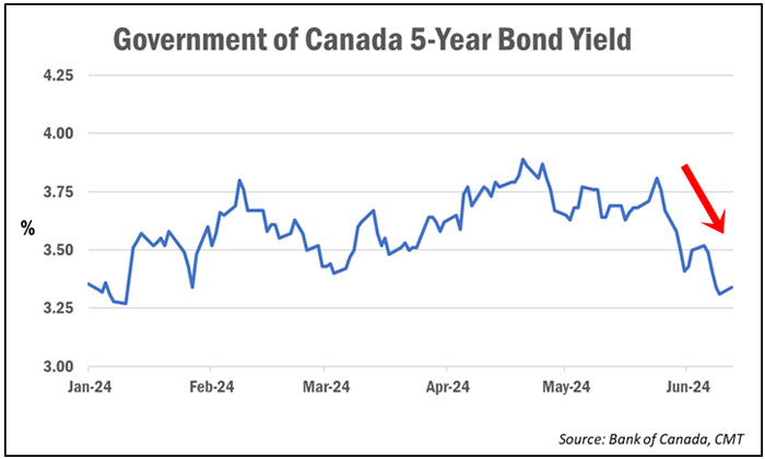 RMG 全国销售副总裁Bruno Valko认为,这一走势与美国的类似走势基本一致,因为这两个市场都在对加拿大和美国最近低于预期的通胀做出反应。他说:随着10年期美国国债收益率的变化,加拿大5年期政府债券收益率也随之变化。
