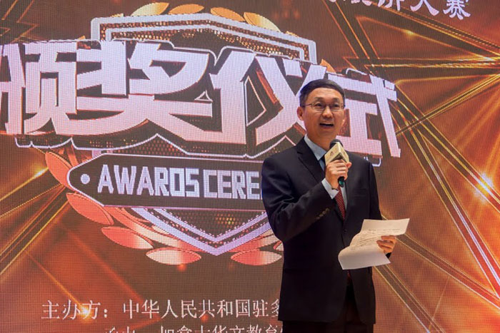 在比赛颁奖仪式上,中国驻多伦多总领事馆总领事韩涛对参赛中小学生的精彩表现大为赞赏,并对家长、老师、学校的支持表示感谢。他表示,语言是了解一个国家、一个民族和一种文化的钥匙。为了在华人青少年中推广中文和中华文化,总领馆在2013年借助两只中国大熊猫在多伦多展出,创办了“中国熊猫杯‘”华裔学生中文系列大赛这个品牌项目,希望为鼓励华裔青少年学习中文,推广中华文化,中加两国交流和友谊提供一个很好的平台。