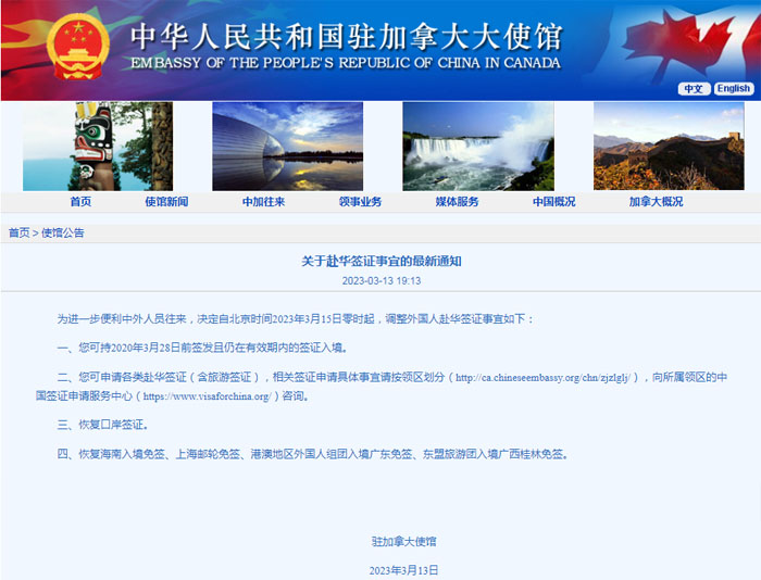 加国生活网编者按:中国驻加拿大使馆在2023年3月13日发布“关于赴华签证事宜的最新通知”,宣布从3月15日起正式恢复仍有效的赴华十年签证。