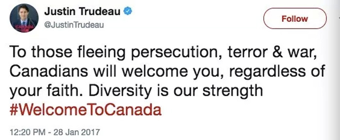 那些希望逃离迫害、恐怖主义还有战火的人们。不管你有何种信仰,加拿大人都欢迎你们。多元化是我们力量的源泉。