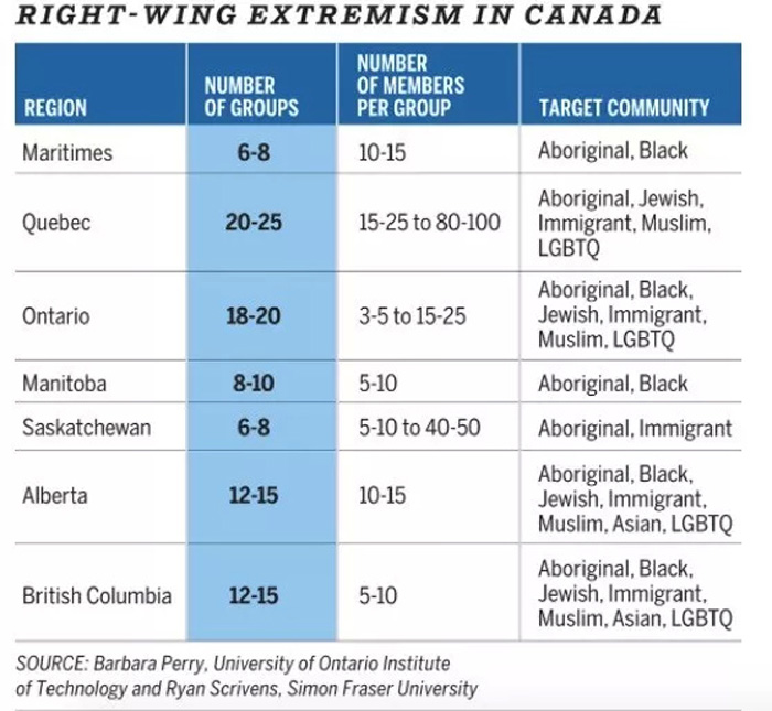 此外,在加拿大约100个右翼极端主义团体中,魁北克占据了20到25个。