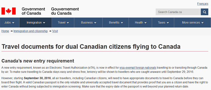 从9月30日起,拥有双重国籍的加拿大人乘飞机返加时,必须使用加拿大护照。