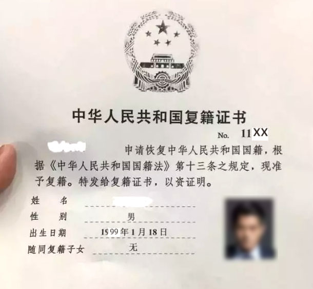 注意:这只代表复籍申请已被批准,不代表已取得中国国籍。
