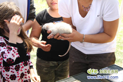 公园里有一些动物组织的摊位。看这里,工作人员的手里拿着一只硕鼠。