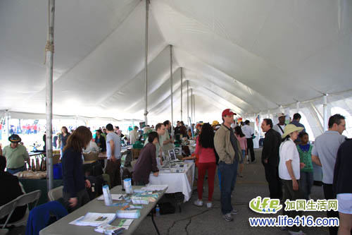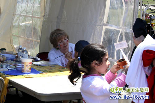 这边这个摊位,排了一队人,原来是给小孩子们画脸的,可以给孩子的脸上画上加拿大国旗,或是地球日的图案等等。