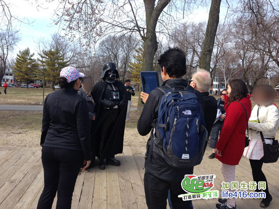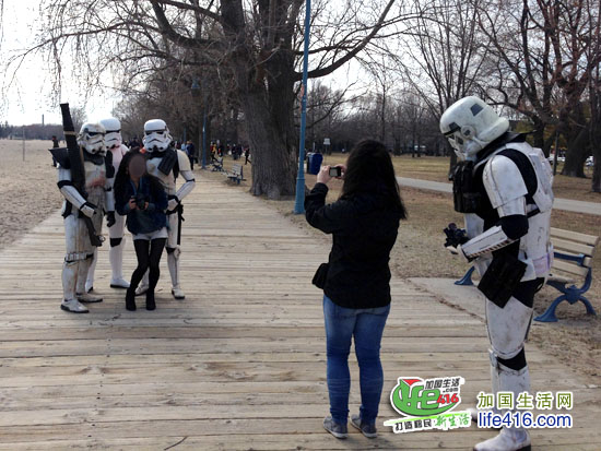 今年的队伍明显没有去年长,一个多小时就结束了。感觉一年不如一年啊,难道加拿大的经济难道越来越差了?游行结束后,许多人到Queen街南边的湖边公园Woodbine Park 散步。遇到starwar的士兵们,合张影吧。