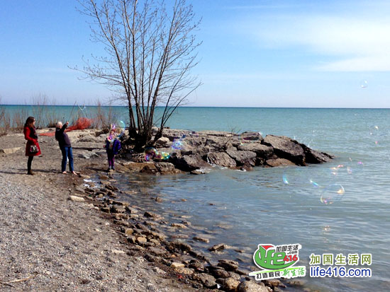 还有人在安大略湖边放着巨大的泡泡,感受着春天的到来……