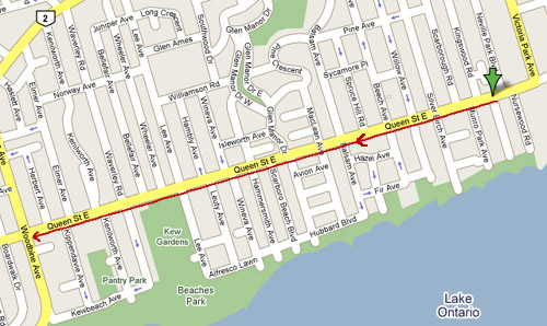 游行线路:从位于Victoria Park Ave 夹 Queen St. E. 的Neville Park 出发,沿Queen街一直向西,到Woodbine Ave. 结束。