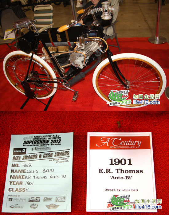 这辆可是1901年的摩托车哟,当时的马达就是这样放在车轮后面的。