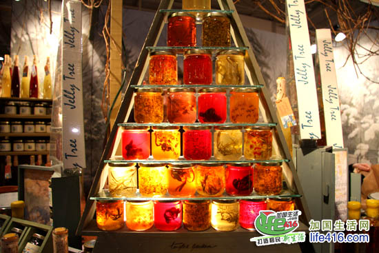 在这个展会中,有两行是专卖美食的,从各种酱料、三文鱼美食、肉类,到巧克力、养生茶、零食等,全部是用加拿大本地产的食品制作的。每个摊位都有免费的sample供大家品尝,因此也是最受欢迎的展区。