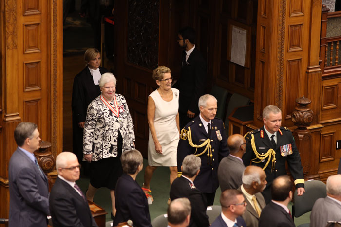 安省省长韦恩与省督杜德丝威尔一起进入省议会。