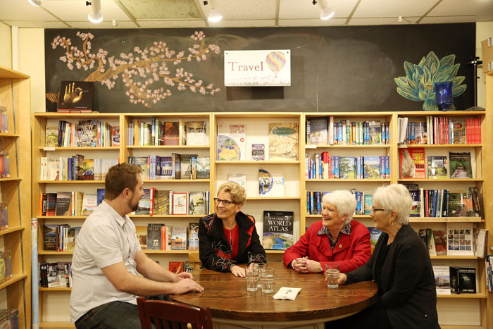 韦恩省长与贵湖一家书店的负责人交谈,了解他的经营状况并讲解省府的减免电费计划。
