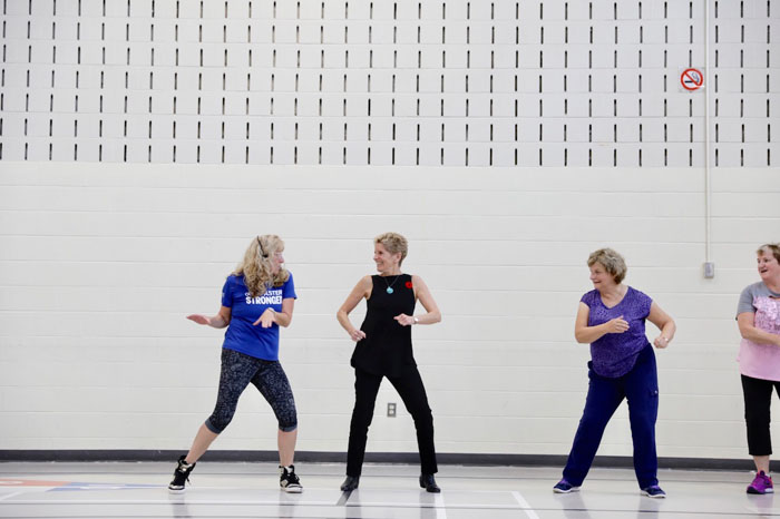 省长韦恩在社区重心与老人们一起跳健身舞。