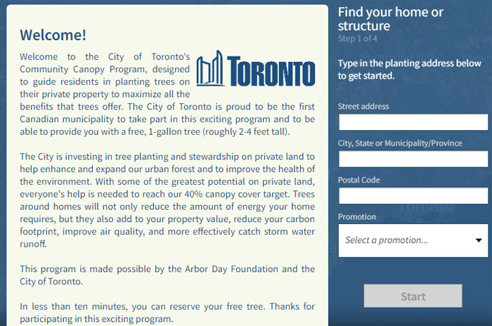 多伦多房主可以通过该计划免费获得一棵大约2-4英尺高的树苗,申请领取非常方便,只需要10分钟左右的时间,通过点击这个项目的网站预订:https://energysavingtrees.arborday.org 。