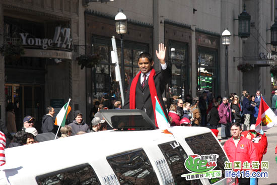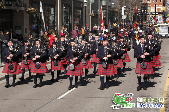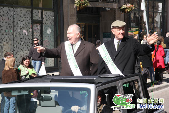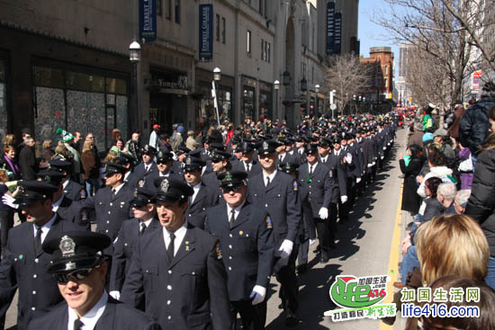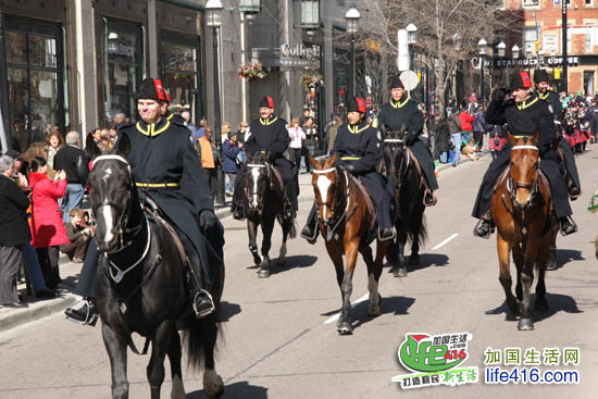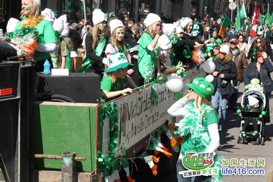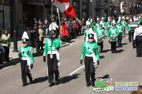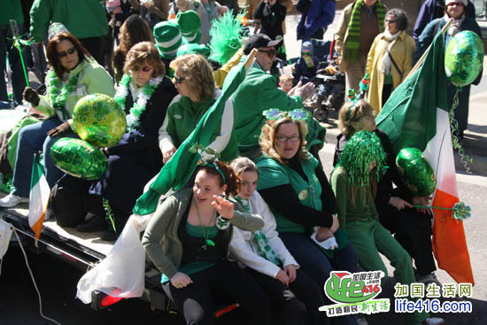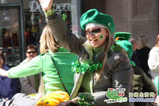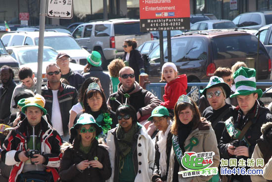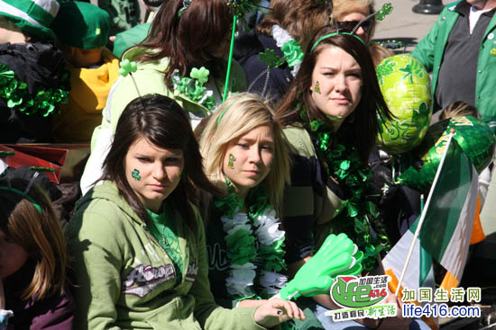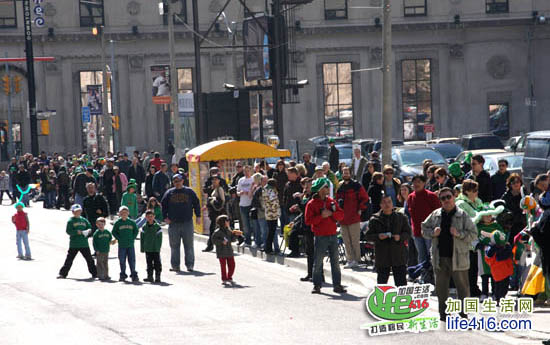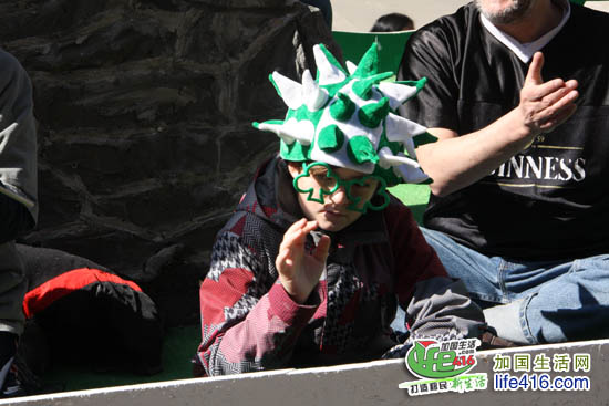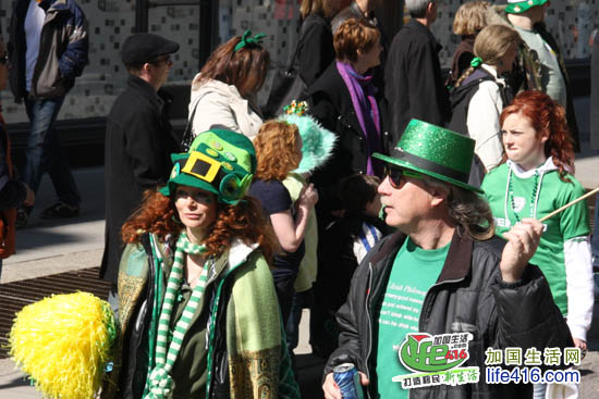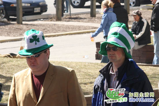 【加国生活网】2009年第22届St. Patrick's Day 于2009年3月15日星期天中午12点在多伦多市中心举行,同以往几届一样,游行路线从Bloor街出发,沿着Yonge街一路南下,到Queen街结束。由于St. Patrick's Day 起源于五世纪末期爱尔兰,用于纪念爱尔兰守护神St. Patrick,三叶苜蓿的绿色是这个节日的形象色,所以每年的St. Patrick's Day大游行的时候,多伦多街头变成了绿色的海洋,许多创意独特的“绿帽子”点缀其中,成为St. Patrick's 大游行一道亮丽的风景线: