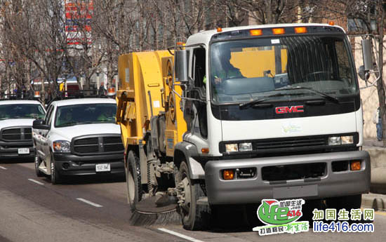 前后有几辆捡垃圾车开道,后面紧跟着这辆大车,边洒水边扫地,游行一结束,路面马上就被清扫干净了,加拿大人的办事效率头一次这么高。