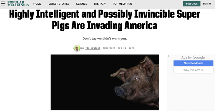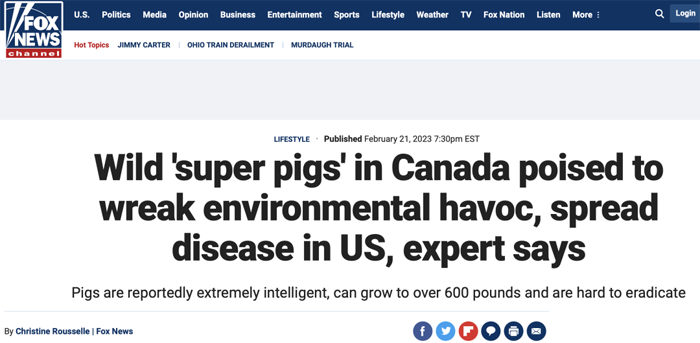 政府估计美国大约有600万头野猪,每年造成15亿美元的损失。这些猪破坏农作物、污染水源、传播疾病,甚至能杀死鹿和麋鹿。为了对付野猪,猎枪、毒药、陷阱都用上了。有些地方“猎猪”成了产业,人们花费数千美元请人用机关枪杀猪。还有的人甚至用上了卧底:先逮住一只游荡的单身猪,套上定位项圈之后放它去寻找猪群。但尽管如此,野猪的族群依然在日益壮大。雪上加霜的是,比美国野猪更大、更强壮、更聪明的大Boss——加拿大“超级猪”正磨牙霍霍,准备南下。