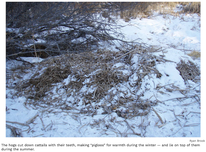 其次,聪明。超级猪越冬的方式是在厚厚的积雪下挖掘2米深的隧道,形成一个雪洞,原理和因纽特人的圆顶雪屋一般无二。洞穴底部和顶部还会铺上香蒲草作为保暖层。这种草是一种常见的本地植物,野猪用自己锋利的牙齿把草割断,然后拖走用来铺床和盖屋顶。