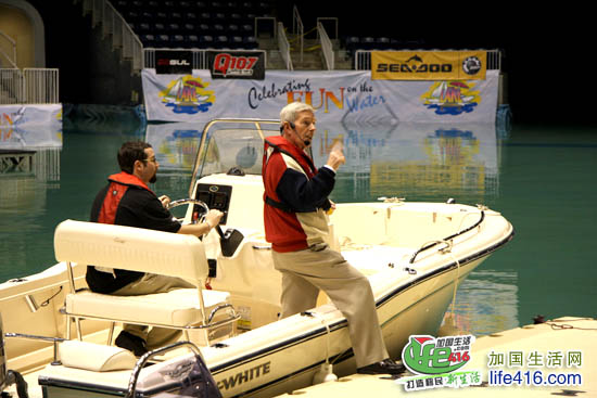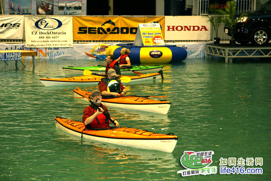 知道多伦多国际游艇展为什么那么受加拿大人的欢迎吗?因为主办方把一些室外活动搬进了室内,他们在游艇展的西北角建了个加拿大最大的室内人工湖(indoor lake)。展览期间,这里除了有不同场次的演出,还现场教参观者如何开游艇、如何滑独木舟等,大人孩子可以亲自坐上小船,体会水上荡舟的魅力。