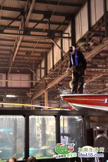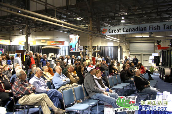 游艇展里还开设了一些免费讲座,比如这个讲座是教大家如何钓鱼。参观者听得认真,讲授者站在大鱼缸子上也教得起劲,连鱼缸里的鱼也很给“面子”,知道自己不会被煮着吃了,使劲地咬钩……