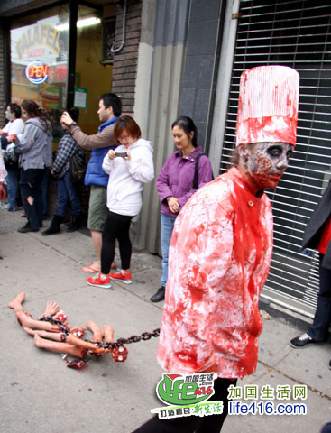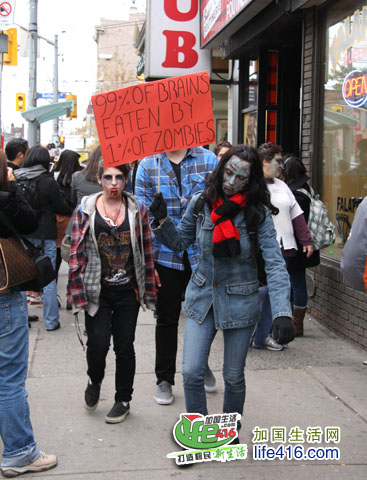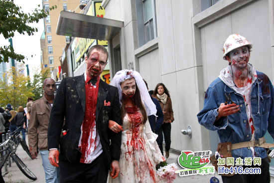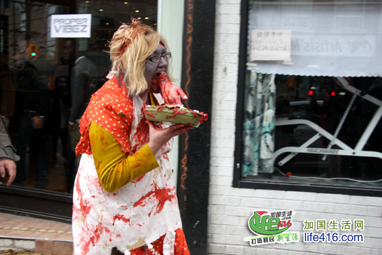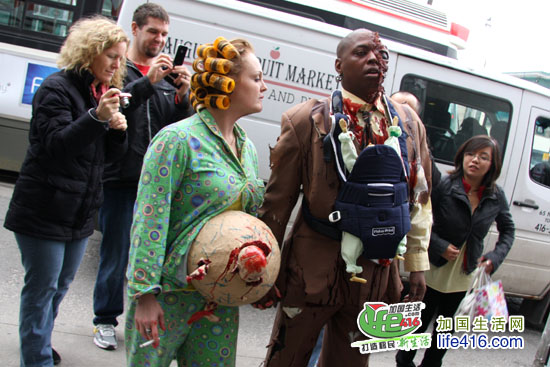 这二位僵尸过了马路,在那里小憩。旁边二楼有一位老兄探出头来,冲着僵尸喊:“HI,我说那位Lady,孕妇不许抽烟啊,这对婴儿不好啊……”四周的人顿时哄堂大笑起来……