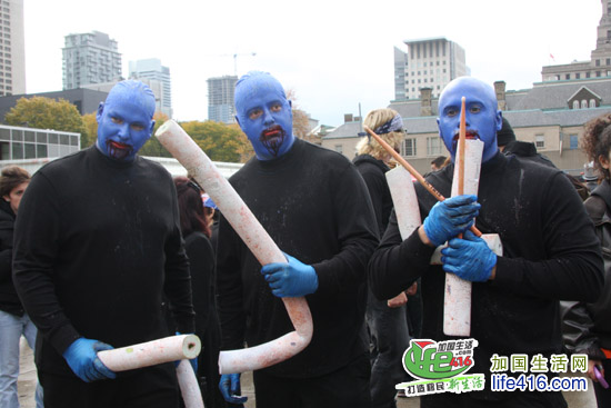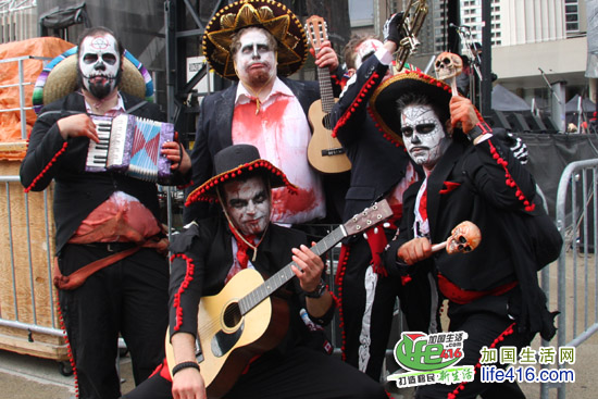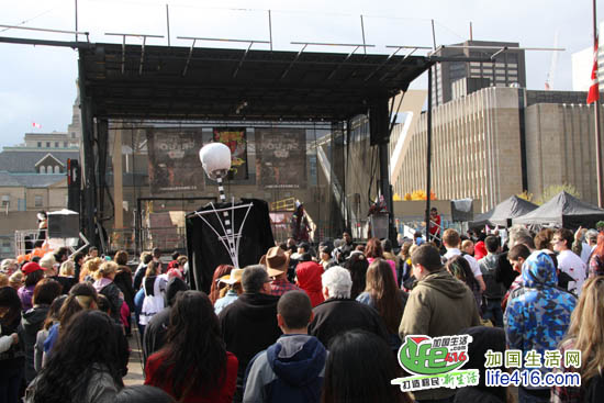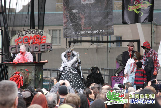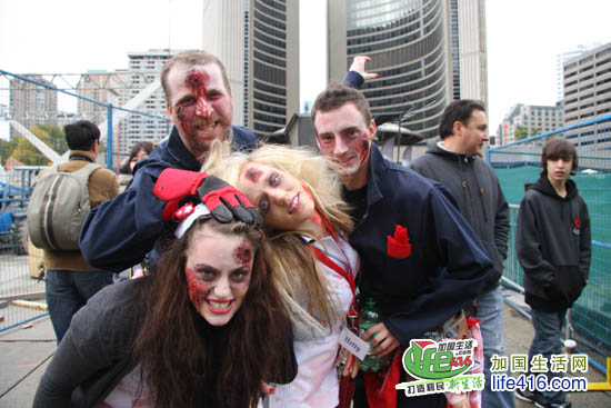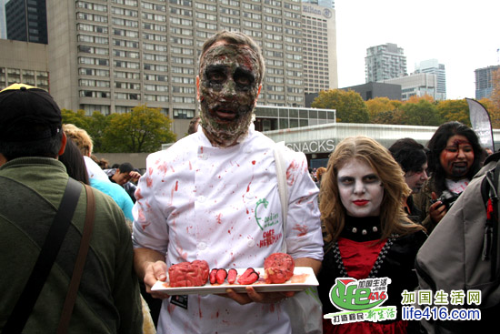 【加国生活网专稿】2012年10月20日星期六,第十届Toronto Zombie Walk 多伦多僵尸大游行在多伦多市政府门前广场Nathan Phillips Square举行。由于今年的活动有Heart and Stroke Foundation 赞助,活动内容与游行路线都与往年有所不同:12pm-2:30pm 僵尸们先在广场碰头,先听听音乐、看看展览;2:30pm 是Toronto Zombie Walk 多伦多僵尸大游行开幕式以及公布僵尸妆评比结果;3pm 僵尸大游行开始,基本上是绕着市政府转圈,呃……;游行完之后就是盛大的现场音乐会,由来自Montreal 的The Brains 乐队演出。