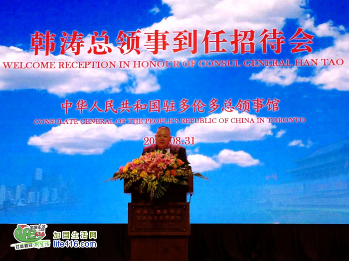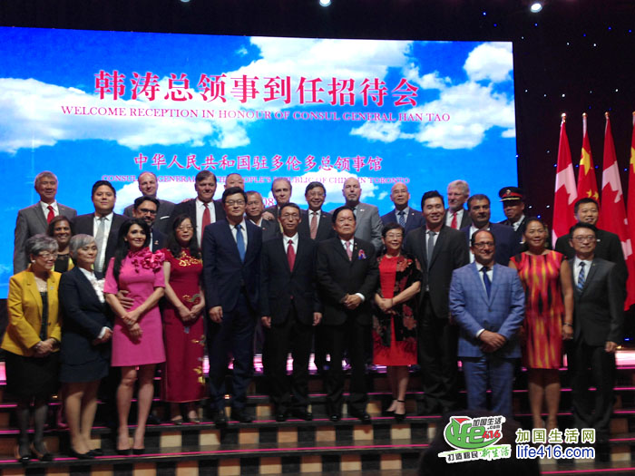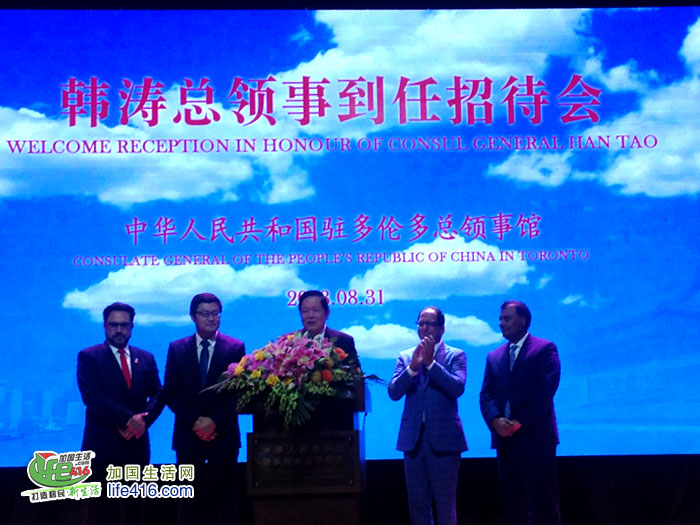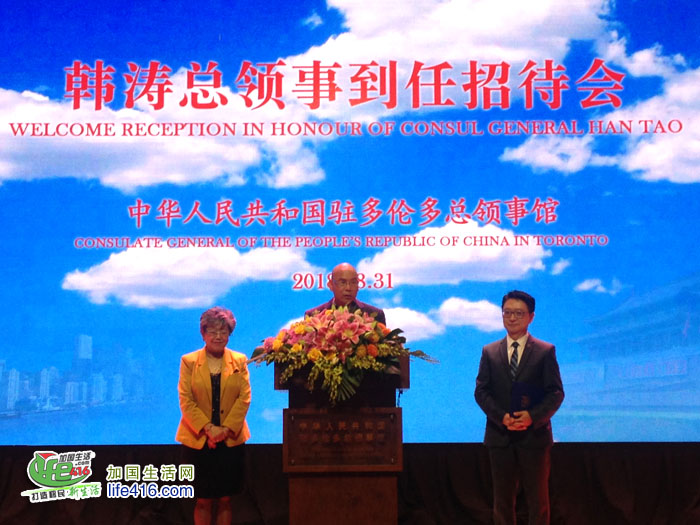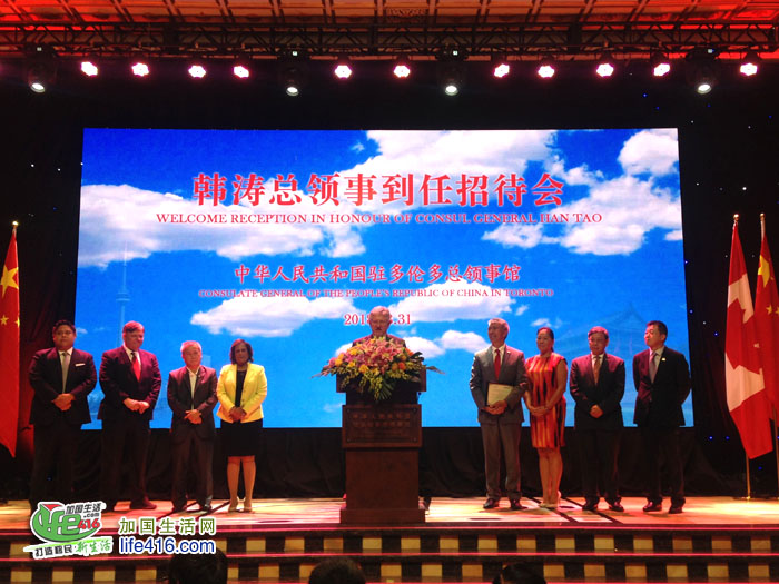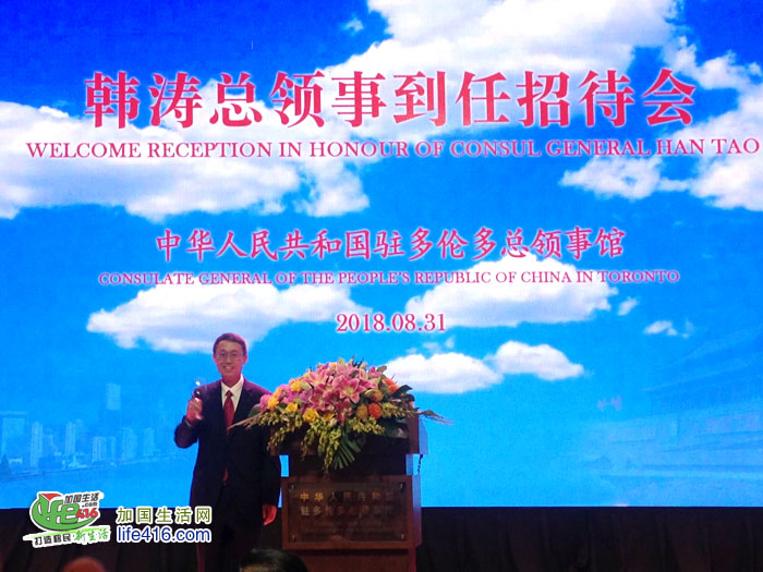 【加国生活网】2018年8月31日,中国驻多伦多总领事韩涛举行到任招待会。加拿大联邦参议员胡子修,联邦众议员谭耕、陈圣源、马万里(Majid Jowhari)、艾萨西(Ali Ehsassi)、蔡报国(Bob Saroya),安大略省省议员柯文彬、韦邱佩芳、彭锦威,列治文山市市长巴罗(Dave Barrow)、卡灵顿市副市长胡伟力和大多伦多地区多位区市议员等加三级政府代表,日本、塞尔维亚、美国驻多伦多总领事等驻多领团代表,以及多伦多华人团体联合总会名誉主席魏成义等华侨华人、中资机构、留学生代表和当地各界人士约800人出席。