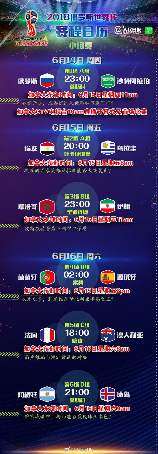 2018年俄罗斯世界杯拉开战幕 官方完整赛程表(加拿大东部时间) - 小组赛(6月14日至6月19日)