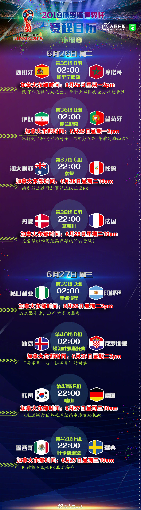 2018年俄罗斯世界杯拉开战幕 官方完整赛程表(加拿大东部时间) - 小组赛(6月23日至6月27日)