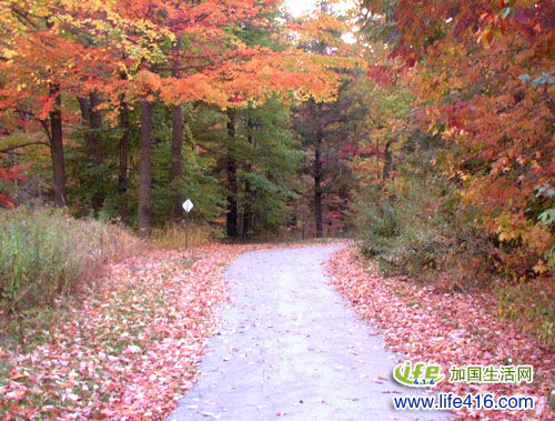 【加国生活网专稿】多伦多爱德华王子公园(Edwards Gardens)位于Lawrence夹Leslie的西南角,里面有一个Thomas J Bata Trail直通Sunnybrook Park。每天,有许多市民在这里跑步、骑自行车、谈恋爱、溜狗。就是在这段Trail里,曲径通幽,满目枫红。那片片的枫叶一点也不比Algonquin(阿岗昆)公园的差。