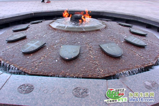 国会大厦前的广场中心有一个为纪念加拿大建国百年而建的长明火台。在喷水池的中央,长明火台的火在阿尔伯塔天然气供给下熊熊地燃烧着,水火交融,仿佛在静 静地讲述着加拿大的百年历史。火台之火点燃于1967年的除夕夜,并会长久地燃烧下去。火台四周雕刻者加拿大各州的徽章,并记载着它们分别加入联邦的日 期。