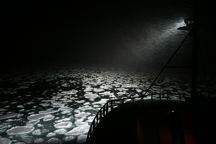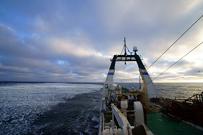 船长不得不放弃了捕捞作业,全速顶浪行驶直到寻找到粘稠的冰粥。