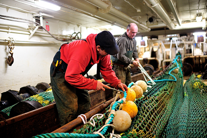 二副带领渔民加紧修复破损的捕捞北极虾的渔网。