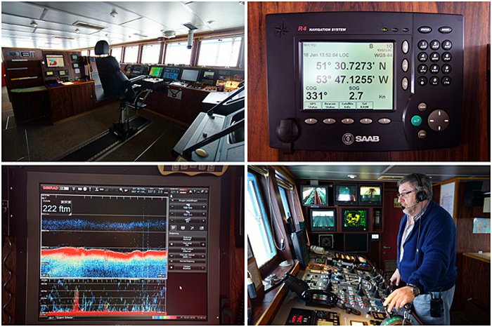 与船长倒班的是大副,大副同样沉稳老道也是丹麦人,而且非常可爱风趣,每天都可以听到他拉网长调的口头禅“Yes Yes Yes”,身宽体胖的大副笑起来浑身都在颤,我们给他起了个外号叫:虾子大副。大副与船长每六小时一倒班,其间船长的咖啡时间由二副顶班。