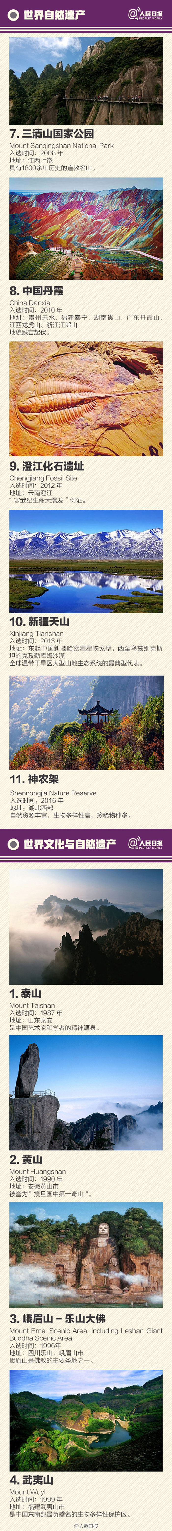2016年7月17日,我国湖北神农架,成功列入世界自然遗产名录。此前,广西“左江花山岩画文化景观”也申遗成功。至此,我国世界遗产总数已达50项!长城、明清故宫、莫高窟、京剧、中医针灸……中国50项世界遗产+38项非物质文化遗产全名录↓丰富的遗产,是文明印记,.....祖国的世界遗产都有哪些,你知道吗?抽空去看看吧!