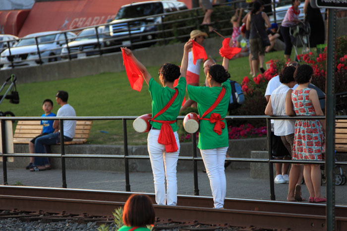 为期三天的白石镇海洋节最后一天,中国大妈在夕阳下准备日落后的火把大游行,红色的腰鼓和绸带,一团火红飘动,颇有文革遗风。