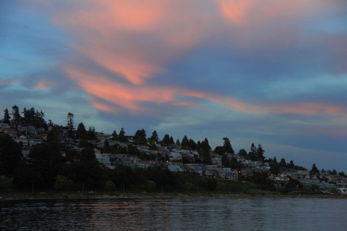 栈桥上风光无限,森林那边远处的雪山身披夕阳,给人以暖洋洋的感觉,近处水边岩石上满是晚归的海鸥,那里是它们的家园。
