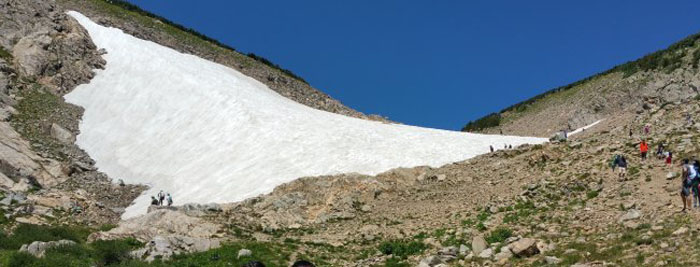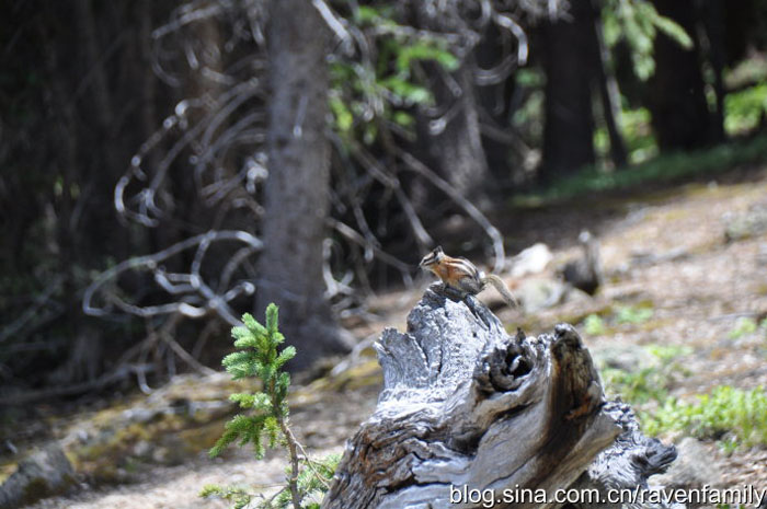 休息了一会儿,宝儿不知道什么时候跟几个小朋友聊上了,也没等爸爸妈妈,自己就跟着那几个孩子从湖边出发开始爬雪山了。等妈妈看见,小家伙已经快到冰川边上了。而我跟贝贝我们俩还在看小花栗鼠和流着松脂的松果 . . . . . . . 。我们还发现了冰川边上的流水,显而易见,那湖水源自冰川上融化的雪水啊。