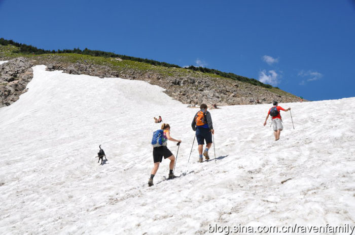 两位小朋友为小花鼠默哀了不到一分钟,马上又被边上的雪峰吸引,这回也不用妈妈劝了,跟着边上的几个小朋友,撒丫子就往山上跑,说真的,8月份的雪山还是很让人感动的,虽说人不多,还是有人(和狗)在雪上玩耍。