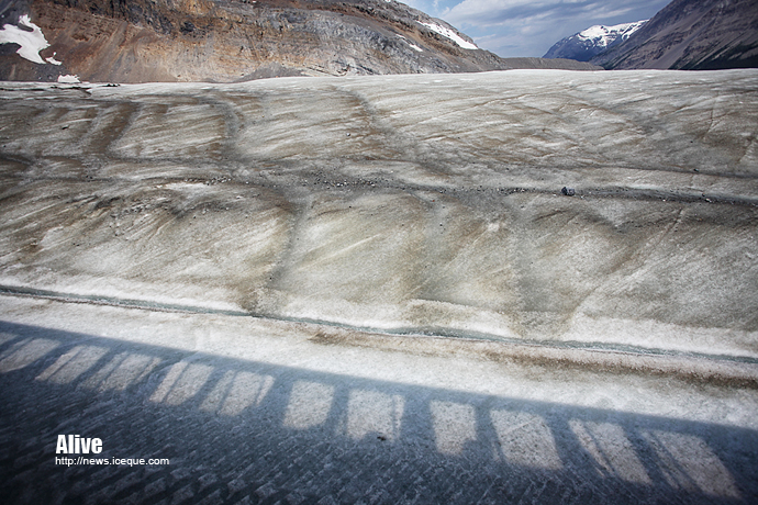 上山的路并没有想象中美好,因为海拔不够高,夏天的时候这里更像是采石场,光秃秃的山石,没有植被,毫无生机。还好只是爬行了几分钟后,司机便招呼我们下车,此行的高潮逐步露出面纱——没错,乘坐冰原探险家号拓冰车爬行冰川。