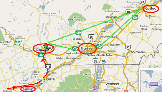 【加国生活网专稿】这是我们此次旅游的大致线路图,大家可以看到渥太华、蒙特利尔、魁北克三个城市的位置呈三角形,我们的旅游线路是先到渥太华,再到蒙特利尔,最后去魁北克。