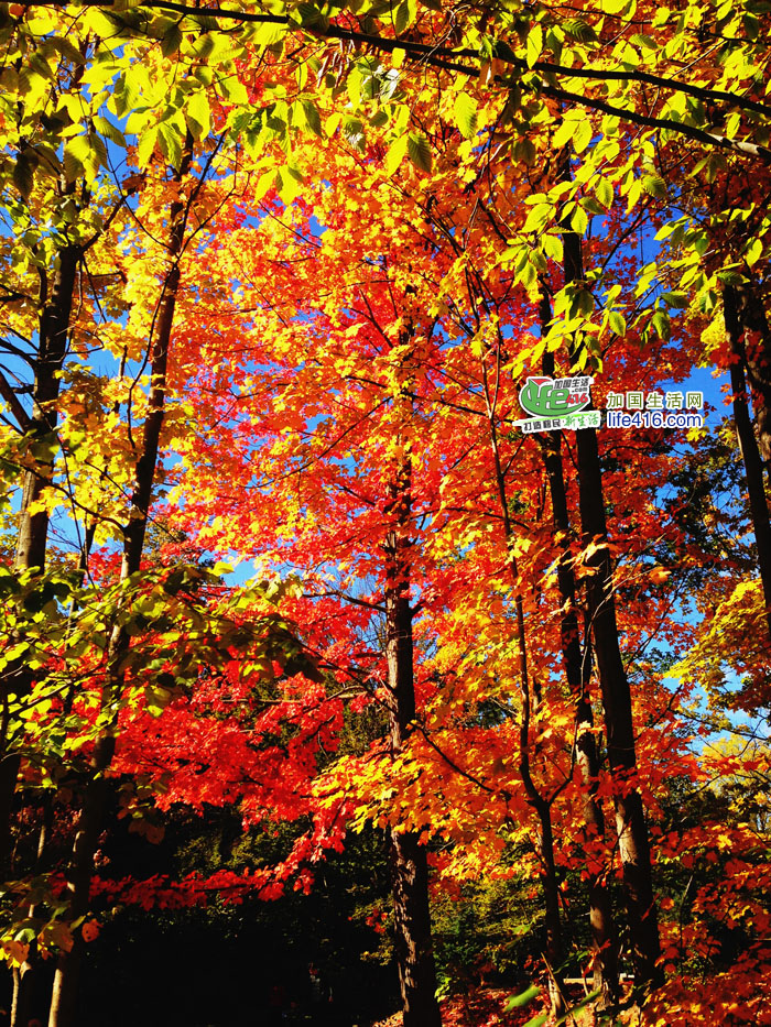 Thomas J Bata Trail入口处有一棵大枫树,枫叶正红得艳丽,360度无方位无死角地漂亮!! 这是从左边树下拍的照片