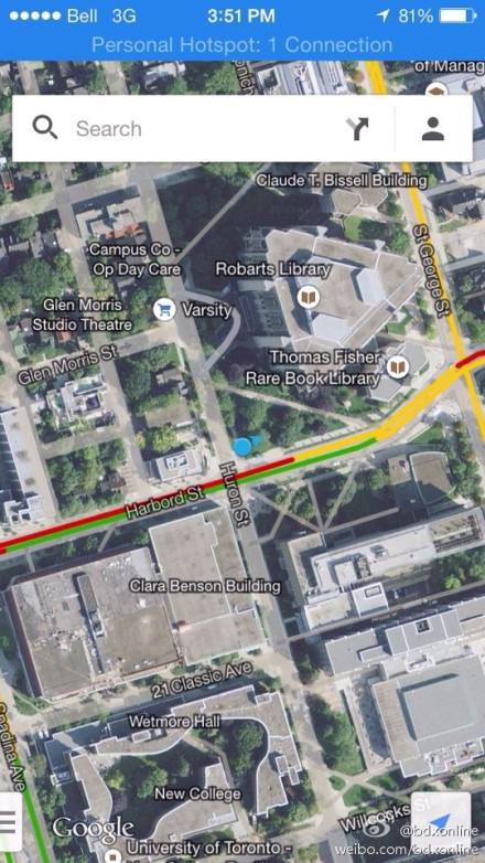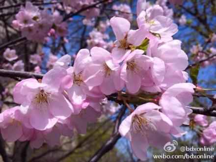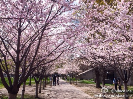 以下是多伦多大学樱花树林的照片,樱花树林在下面地图的蓝色圆点箭头那里,huron & harbord。照片来源:bdxonline新浪微博 http://www.weibo.com/1774905791/B3JAprTWA。