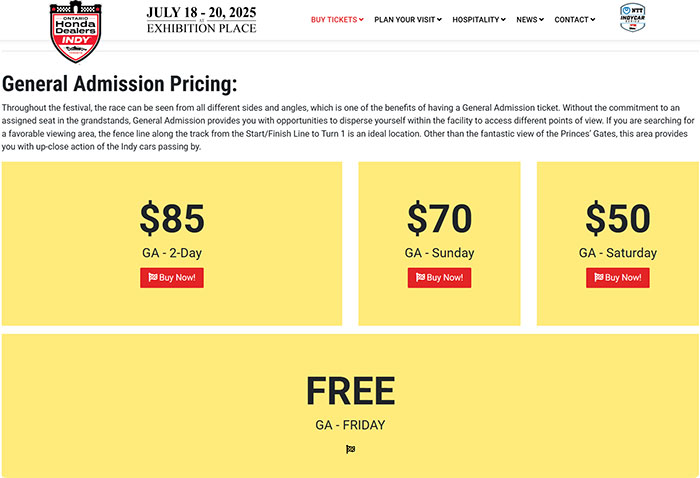 每年这项比赛举行的时候,都会举行Fan Friday的活动。今年这项活动继续举行,由Ontario Honda Dealers Association 继续赞助(已经连续赞助了14年),2025年7月18日到Honda Indy免费入场。主办方希望大家星期五到现场的时候,参与某些项目的活动时能够慷慨捐款。还有一个优惠,是2025年最新启动的,7月18日免费入场日这一天,如果你是Presto卡用户,可使用Presto卡号来领取最多两张免费的Paddock Passes(每张价值$60),此优惠是Free Fan Friday免费入场日的其中一部分优惠项目(详情请点击这里)。