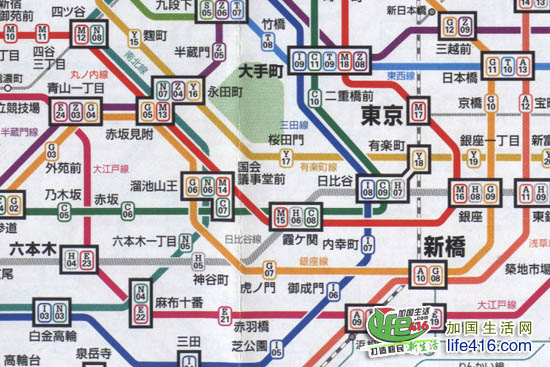 东京地铁线路图其中一部分放大图解